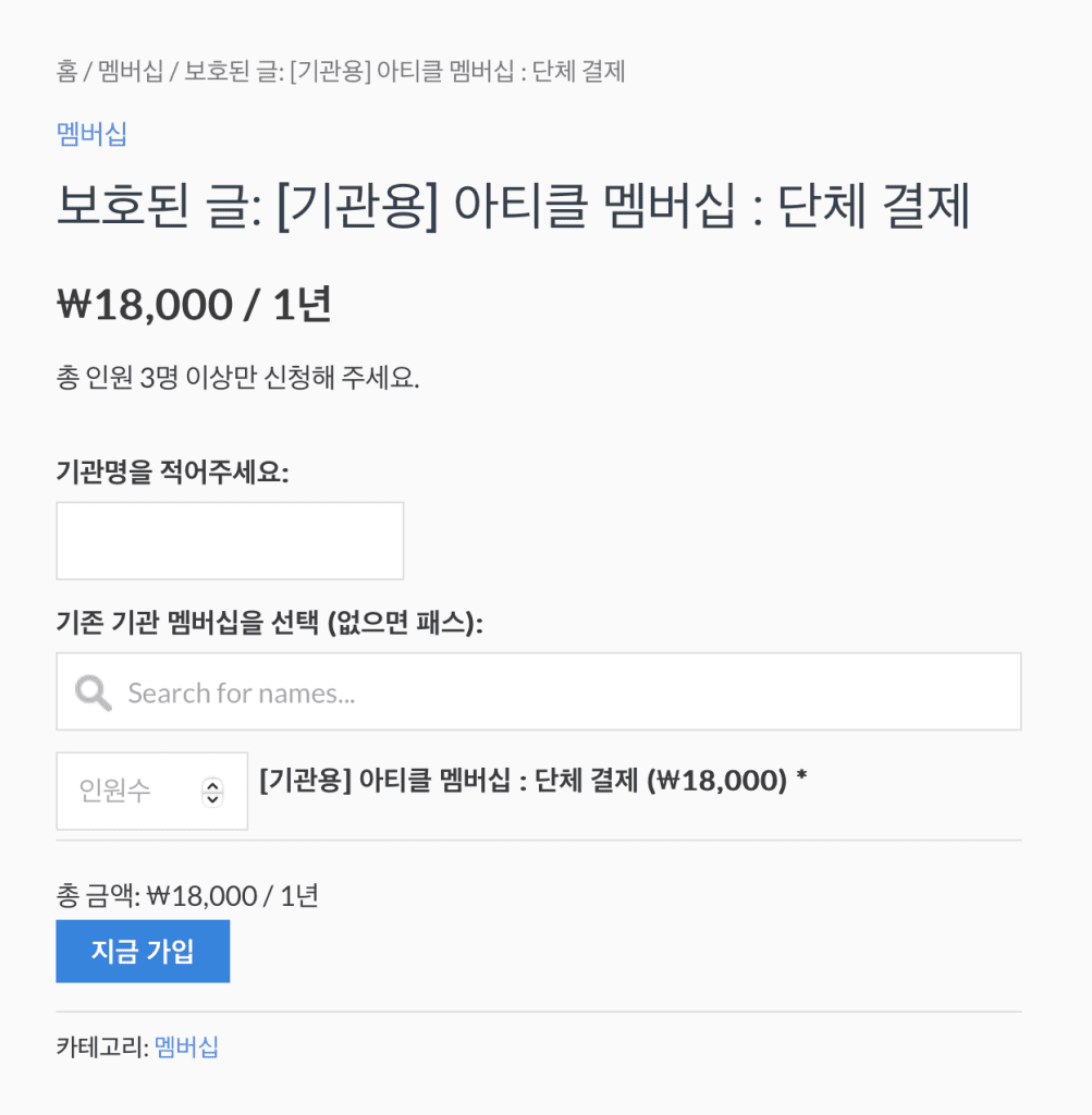 아래 [기관용] 아티클 멤버십 : 단체 결제 를 클릭합니다.