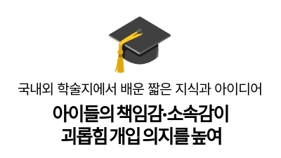 한 연구에서 방과 후 활동에서 또래 괴롭힘을 아이들이 목격했을 때 얼마나 개입할 의지가 있는가, 누가 적극적으로 개입하는가를 살폈습니다. 연구 결과, 아이들은 생각보다 개입할 의지가 높았는데, 그 중 방과 후 활동에 개인적으로든 사회적으로든 책임감이 있는 아이들, 그룹에 소속감을 느끼는 아이들이 더 적극적이었다고 합니다.