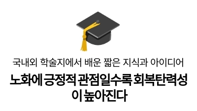 에디터 의견: 노인과 노화에 대한 긍정적 관점을 가질수록 자기 삶에 대한 통제감이 늘어난다고 합니다. 통제감이 높은 사람은 삶에서 발생하는 일들에 더 잘 대처할 수 있다는 믿음을 가지며, 이는 스트레스 상황에서도 긍정적으로 적응할 수 있게 된다고 합니다. 결과적으로 개인의 회복탄력성을 높이는 것으로 나타났습니다.