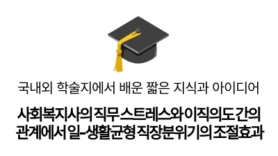 에디터 의견: 시회복지사의 직무 스트레스는 이직의도에 직접적으로 영향을 미칩니다. [직무 스트레스 → 이직 의도] 다만, 일-생활균형의 직장 분위기가 긍정적일수록 이를 완충하는 것으로 나타났습니다. [ 직무 스트레스↗↗ → 일-생활균형에 대한 긍정적 직장 분위기↗ (완충) → 이직 의도↘ ] 사회사업은 사람에 의한 서비스이고, 서비스 질을 유지하려면 이직의도를 낮추는 것이 중요합니다. 이를 조절하는 중요한 변수가 일-생활균형 직장분위기입니다. 최고리더는 기관의 목적을 달성하기 위해 일-생활균형 직장분위기를 만들 필요가 있습니다.
