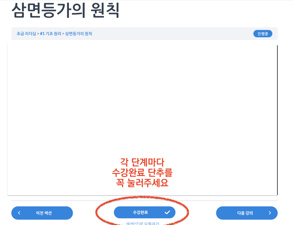 각 동영상 시청 후 각각 ‘수강완료’ 단추를 눌러야 수강완료가 됩니다.