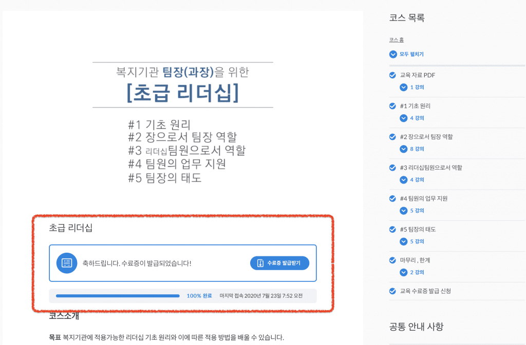 100% 완료하시면 ‘코스 안내 페이지’에 수료증 발급 단추가 자동으로 생성됩니다.